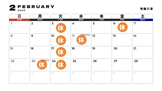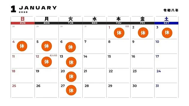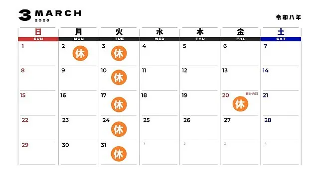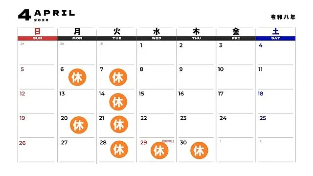 色のついているところが定休日となります。